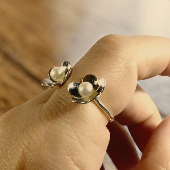 El Anillo Flores y Perlas está elaborado a mano en Plata de Primera Ley 925 y diseñado como un anillo abierto y ajustable. Su composición combina flores de plata con perlas cultivadas de pequeño tamaño, creando una pieza equilibrada, ligera y fácil de llevar.