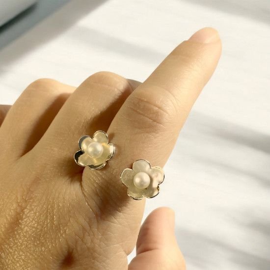 Anillo ajustable de plata con flores y perlas cultivadas.
